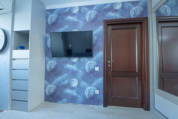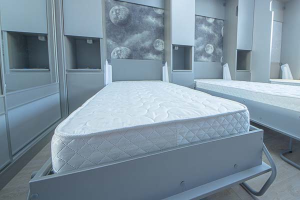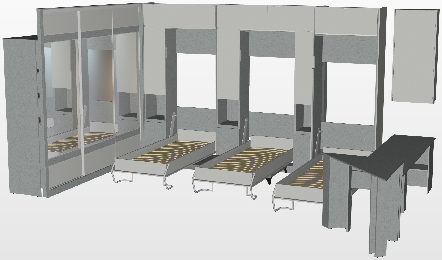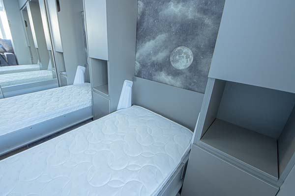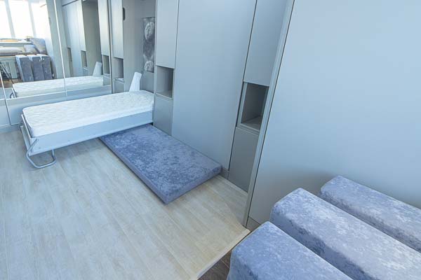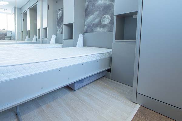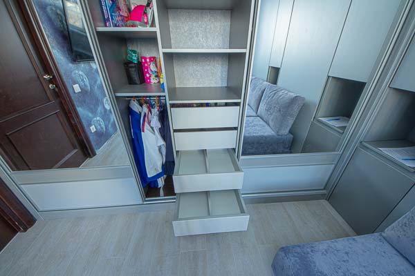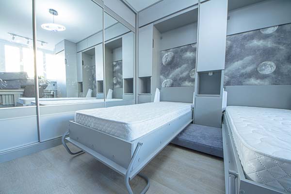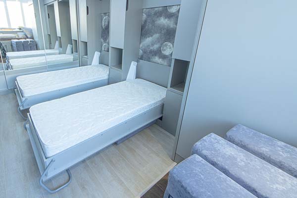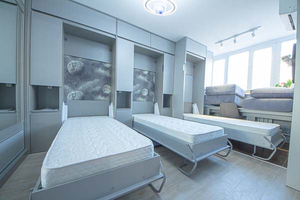 Один из большой проектов детской комнаты площадью почти двадцать квадратных метров. Такой объем удолось получить присоединением к комнате большой лоджии. И в получившемся помещении нужно было разместить три полноценные кровати с матрацами (800 мм*2000 мм), огромный шкаф-купе с отделениями для каждого ребенка, пеналы для хранения постельного и вещей, огромный стол вдоль окна, большой диван. А напротив него расположили шкаф для учебных принадлежностей и телевизор. Над кроватями находятся вместительные антресоли. Вся мебель расположлась вдоль стен и в комнате осталось еще много место для веселого время провождения и учебы. При открытых кроватях был предусмотрен свободный транзит детей. Комната была выполнена в светло серых тонах. Мателириал подбирался клиентами под космическую тематику. Это вск удолось воплотить в жизнь только с помощью трансформирующейся мебели, до этого в комнате находилась двухъярусная кровать с двухспальным диваном и свободного пространства в комнате совсем не было.