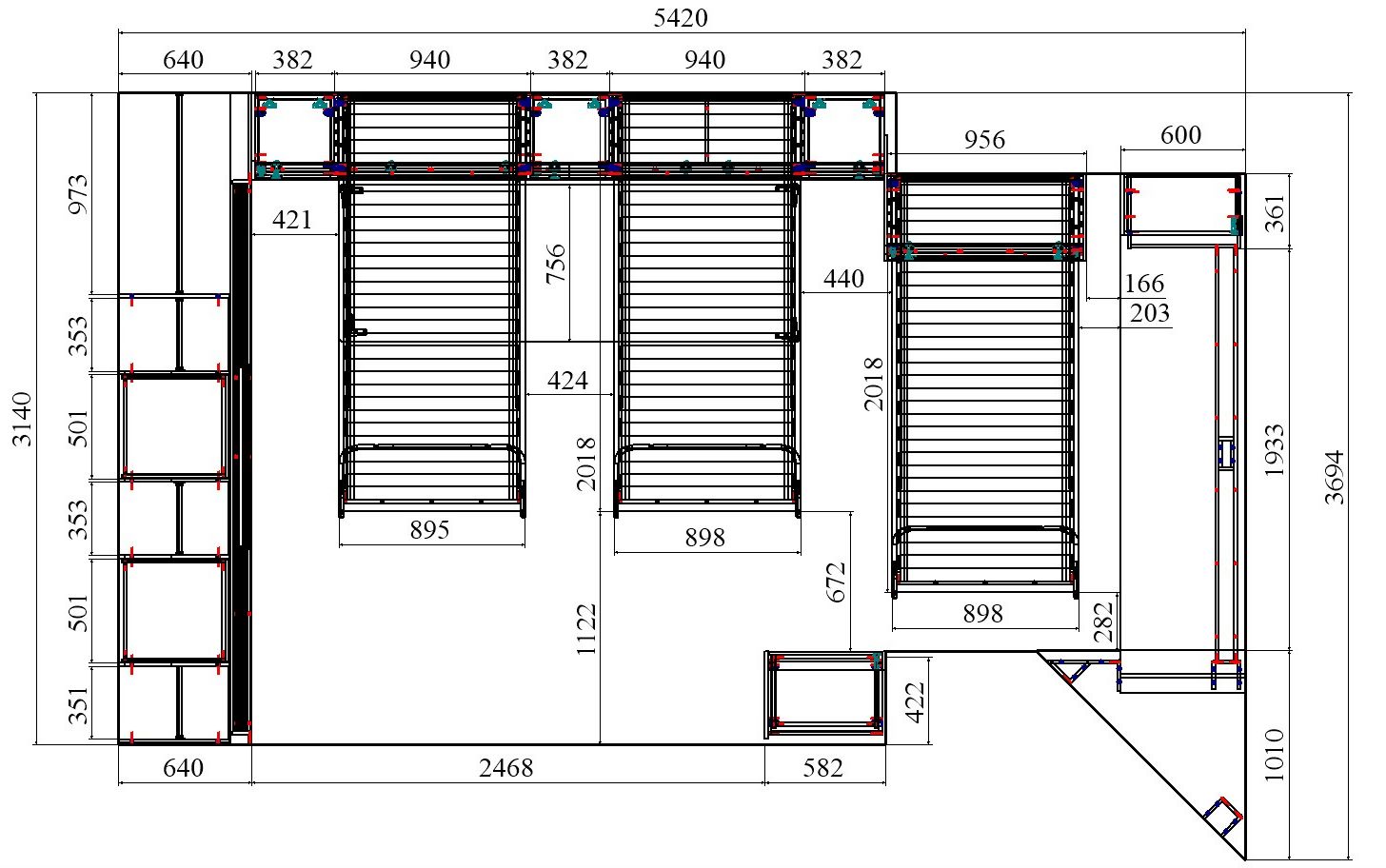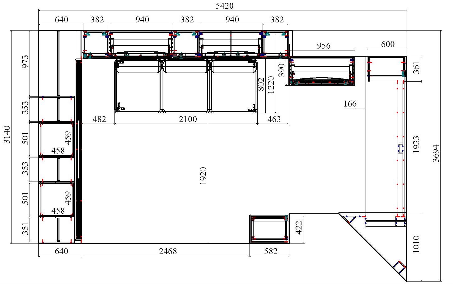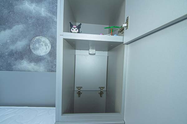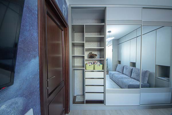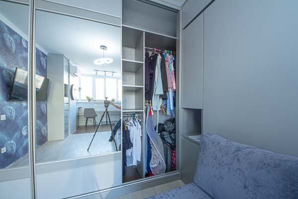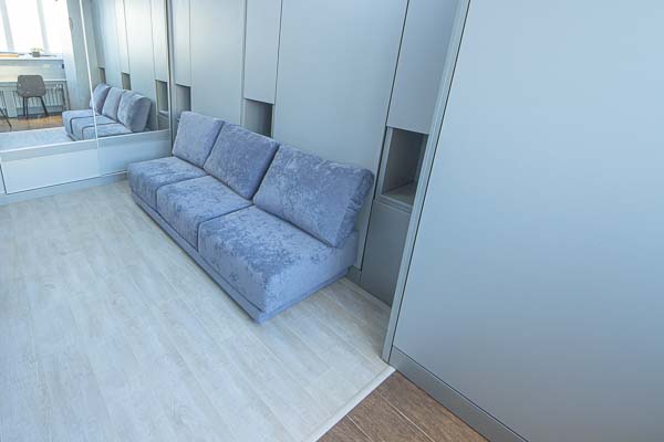 Один из большой проектов детской комнаты площадью почти двадцать квадратных метров. Такой объем удолось получить присоединением к комнате большой лоджии. И в получившемся помещении нужно было разместить три полноценные кровати с матрацами (800 мм*2000 мм), огромный шкаф-купе с отделениями для каждого ребенка, пеналы для хранения постельного и вещей, огромный стол вдоль окна, большой диван. А напротив него расположили шкаф для учебных принадлежностей и телевизор. Над кроватями находятся вместительные антресоли. Вся мебель расположлась вдоль стен и в комнате осталось еще много место для веселого время провождения и учебы. При открытых кроватях был предусмотрен свободный транзит детей. Комната была выполнена в светло серых тонах. Мателириал подбирался клиентами под космическую тематику. Это вск удолось воплотить в жизнь только с помощью трансформирующейся мебели, до этого в комнате находилась двухъярусная кровать с двухспальным диваном и свободного пространства в комнате совсем не было.