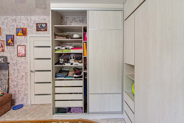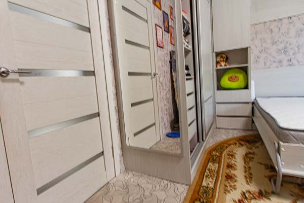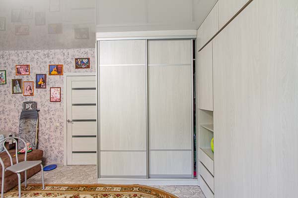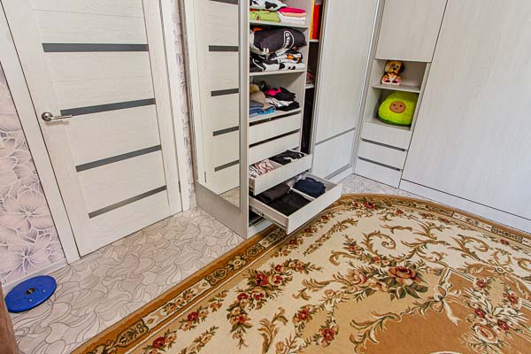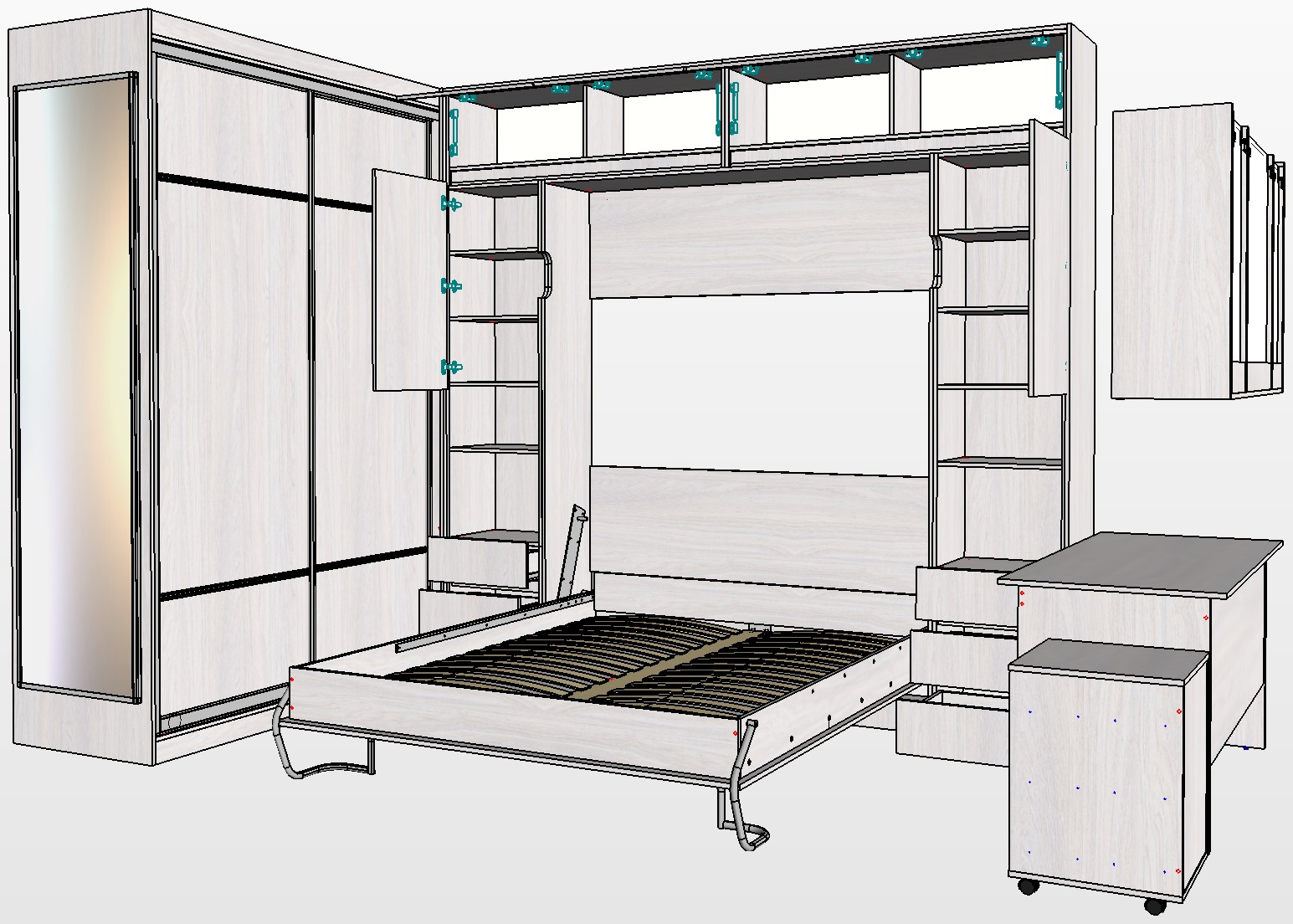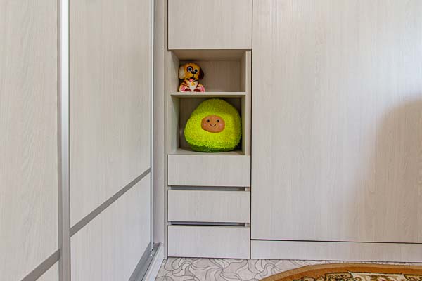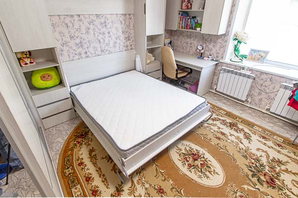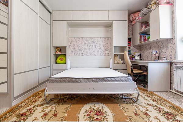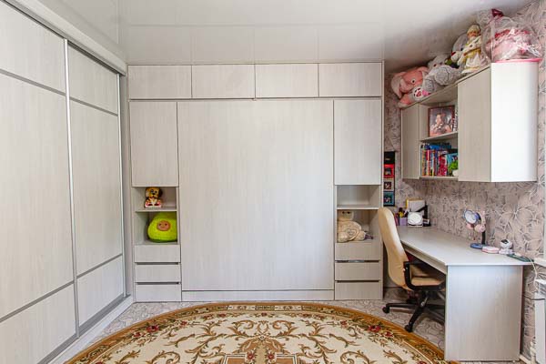 В однокомнатной квартире необходимо было разместить кровать, диван и места для хранения. Угловой диван в комнате уже был, но клиенты спать на нем не хотели, а ставить в гостиной кровать не имело смысла, потому что в комнате не осталось бы свободного места. Поэтому двухспальная шкаф-кровать трансформер и шкафы для хранения — это было единственное решение для однокомнатной, многофункциональной квартиры. Цвет мебели подобрали под интерьер.