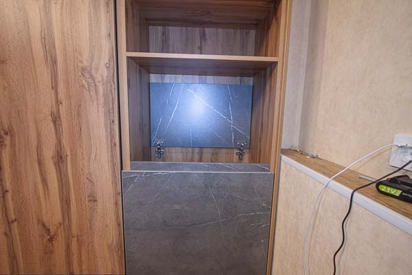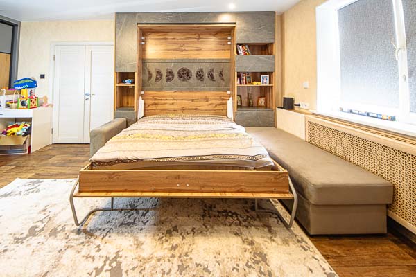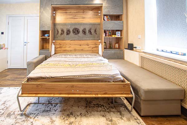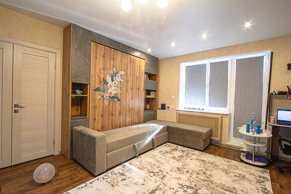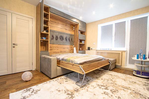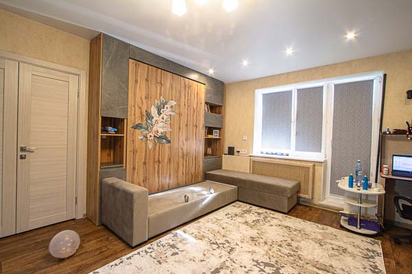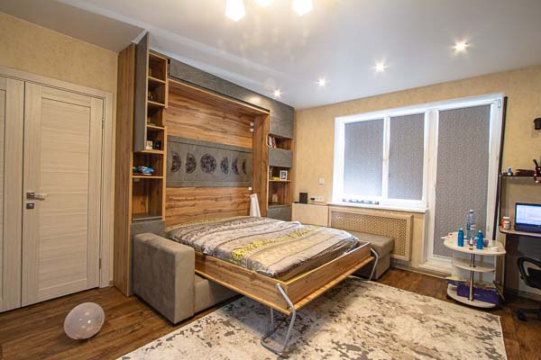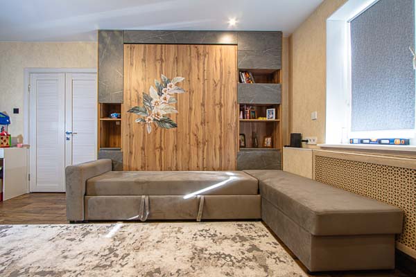 В двухкомнатной квартире в гостиной была оборудована спальня. В простенок, где стоял диван, решили поставить двухспальную шкаф кровать трансформер с угловым диваном. Потому что спать на диване было не удобно, а ставить в гостиной кровать не имело смысла. Для хорошего, полноценного сна нужно, чтобы у Вас была кровать с хорошим ортопедическим матрацем. Двухспальная шкаф-кровать трансформер со шкафами для хранения — это решение для многофункциональных комнат. Цвет мебели подобрали под интерьер, присутствующий в комнате.