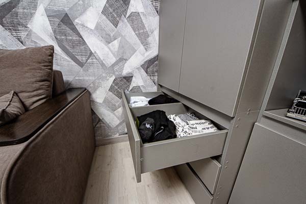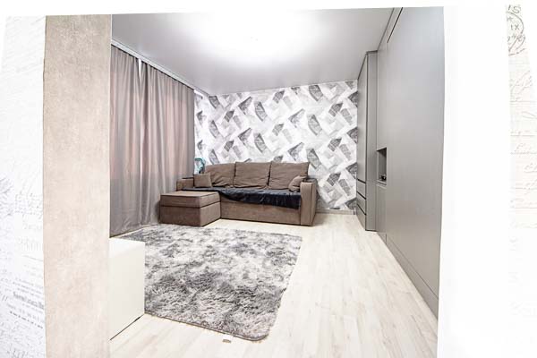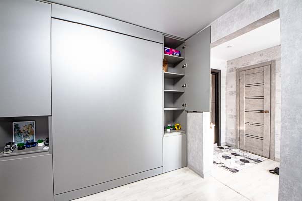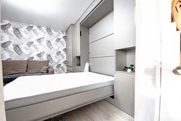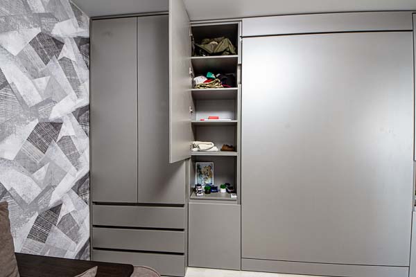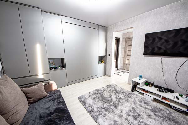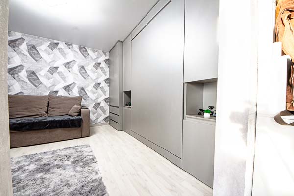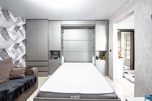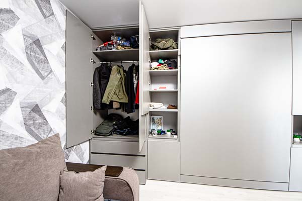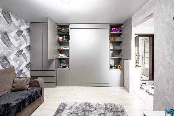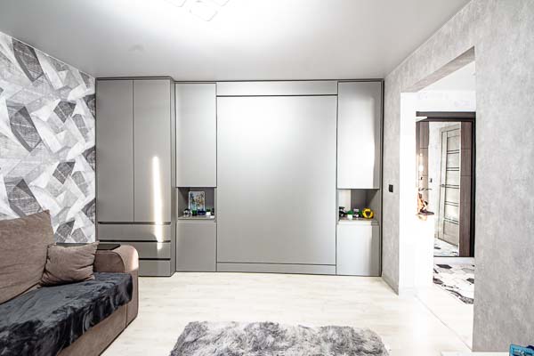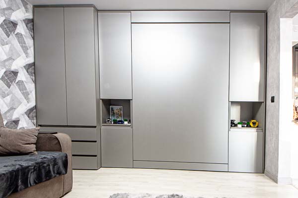 В однокомнатной квартире необходимо было разместить кровать, диван и места для хранения. Угловой диван в комнате уже был, но клиенты спать на нем не хотели, а ставить в гостиной кровать не имело смысла, потому что в комнате не осталось бы свободного места. Поэтому двухспальная шкаф-кровать трансформер и шкафы для хранения — это было единственное решение для однокомнатной, многофункциональной квартиры. Цвет мебели подобрали под интерьер.
