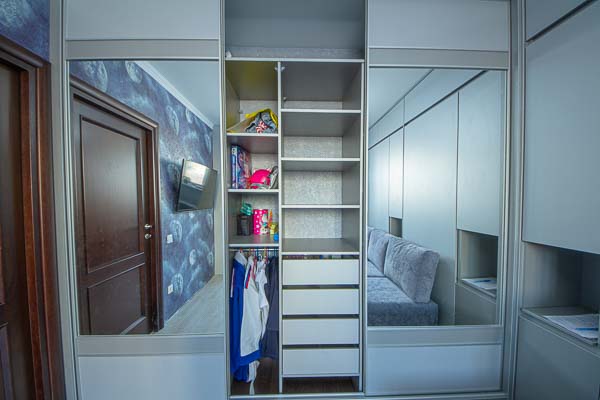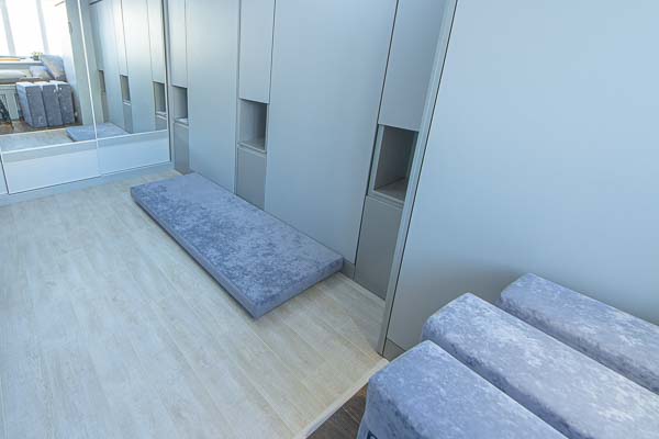 Один из большой проектов детской комнаты площадью почти двадцать квадратных метров. Такой объем удолось получить присоединением к комнате большой лоджии. И в получившемся помещении нужно было разместить три полноценные кровати с матрацами (800 мм*2000 мм), огромный шкаф-купе с отделениями для каждого ребенка, пеналы для хранения постельного и вещей, огромный стол вдоль окна, большой диван. А напротив него расположили шкаф для учебных принадлежностей и телевизор. Над кроватями находятся вместительные антресоли. Вся мебель расположлась вдоль стен и в комнате осталось еще много место для веселого время провождения и учебы. При открытых кроватях был предусмотрен свободный транзит детей. Комната была выполнена в светло серых тонах. Мателириал подбирался клиентами под космическую тематику. Это вск удолось воплотить в жизнь только с помощью трансформирующейся мебели, до этого в комнате находилась двухъярусная кровать с двухспальным диваном и свободного пространства в комнате совсем не было.