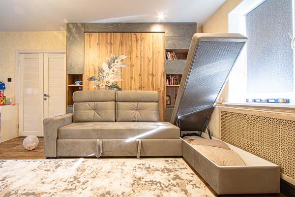 В двухкомнатной квартире в гостиной была оборудована спальня. В простенок, где стоял диван, решили поставить двухспальную шкаф кровать трансформер с угловым диваном. Потому что спать на диване было не удобно, а ставить в гостиной кровать не имело смысла. Для хорошего, полноценного сна нужно, чтобы у Вас была кровать с хорошим ортопедическим матрацем. Двухспальная шкаф-кровать трансформер со шкафами для хранения — это решение для многофункциональных комнат. Цвет мебели подобрали под интерьер, присутствующий в комнате.